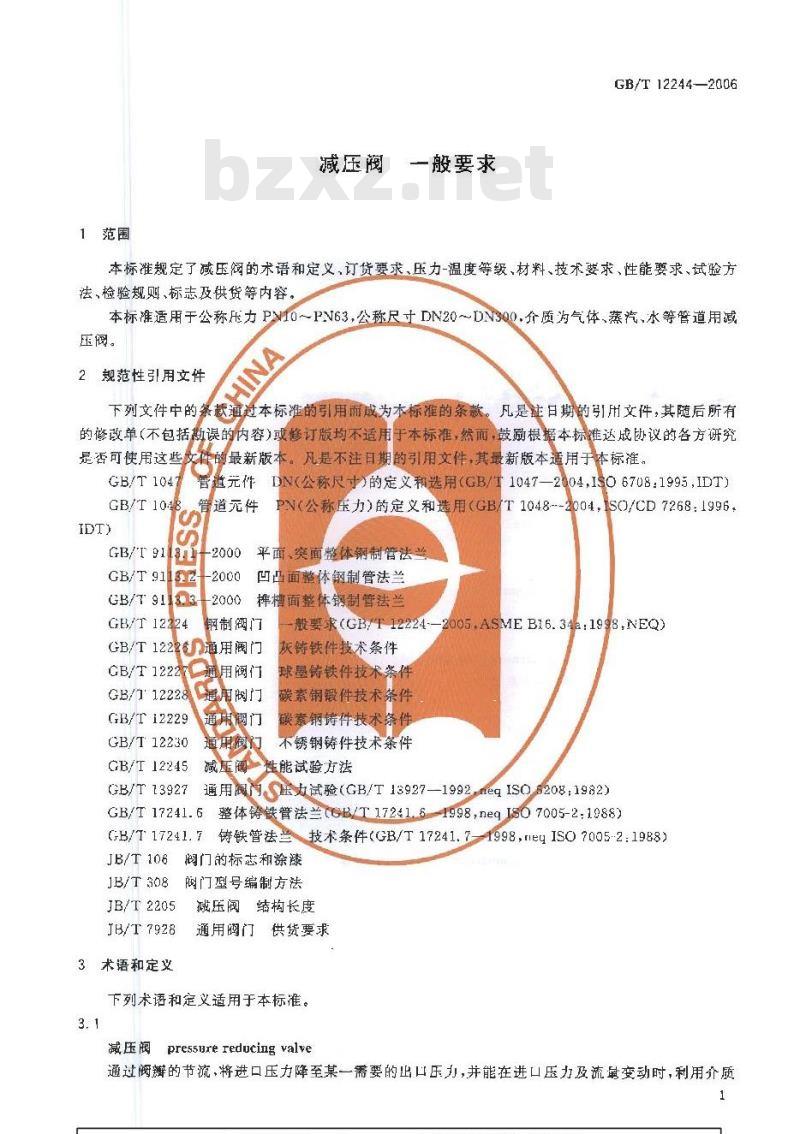 本标准规定了减压阀的术语和定义、订货要求、压力-温度等级、材料、技术要求、性能要求、试验方法、检验规则、标志及供货等内容。 本标准适用于公称压力PN10~63,公称尺寸DN20~DN300,介质为气体、蒸汽、水等管道用减压阀。 GB/T 12244-2006 减压阀 一般要求 GB/T12244-2006