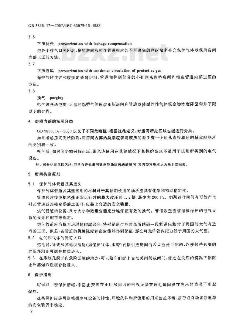 GB 3836. 17-2007/IC 60079-13: 1982本部分为GB3836的第17部分,等同采用IEC60079-13:1982≤爆炸性气体环境电气设备第13部分,正压房间或建筑物的结构和使用英文版)。本部分规定了在位于可能存在爆炸性气体或蒸气的环境中的房闻或建筑物中,使用能解成为点燃源的电气设备。