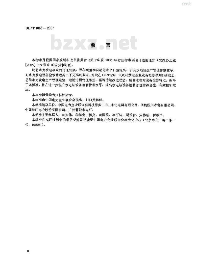 本标推由中国电力企业联合会提出,归口并解释。本标准起草单位:中国电力企业联合会科技服务中心、东北电网有限公司、华能泗川水电有限公司、中国长江电力股份有限公司、广州蓄能水电厂。本标准主要起草人:韩大伟、华觉定、杨克、黄国祯、李平诗、胡长青、宋伟新、付维平。本标准在执行过程中的意见或建议反馈至中国电力企业联合会标准化中心(北京市白广路二条一号,100761)。