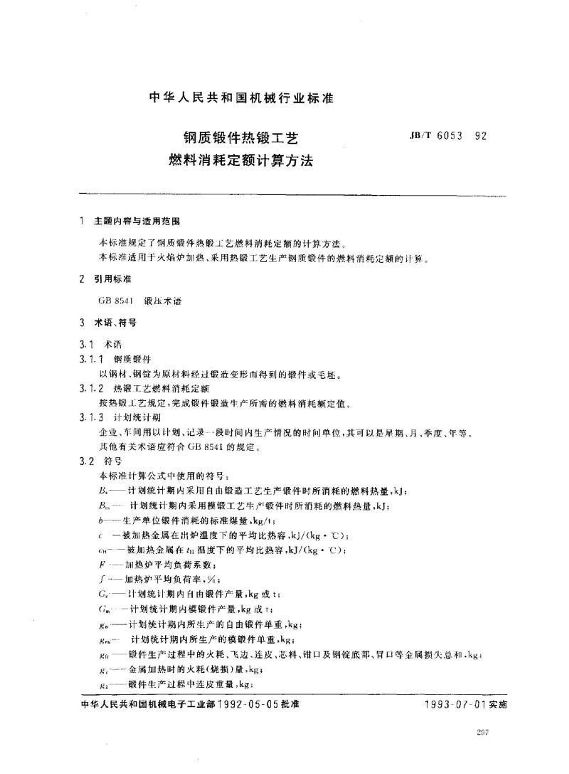 - JB/T 6053-1992 钢质锻件热锻工艺燃料消耗 定额计算方法