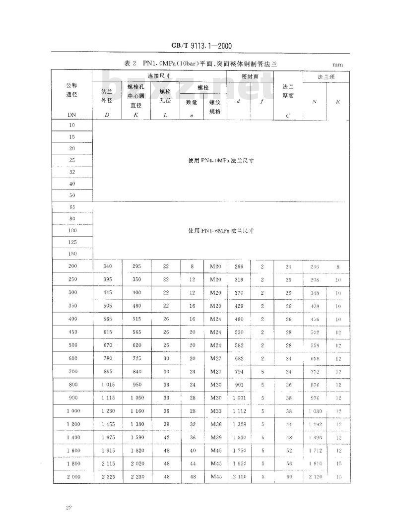 代替(GB/T 9113.1~9113.8-- 1988本标准规定了公称压力PN为0.6、1.0、1.6、2.5、4.0、6.3、10.0、16.0MPa和公称压力PN为2.0、5.0、11.0、15.0、26.0、42.0MPa的平面、突面整体钢制管法兰的型式和尺寸。本标准适用于公称压力PNO.6~PN42.OMPa的平面、突面整体钢制管法兰。2引用标准