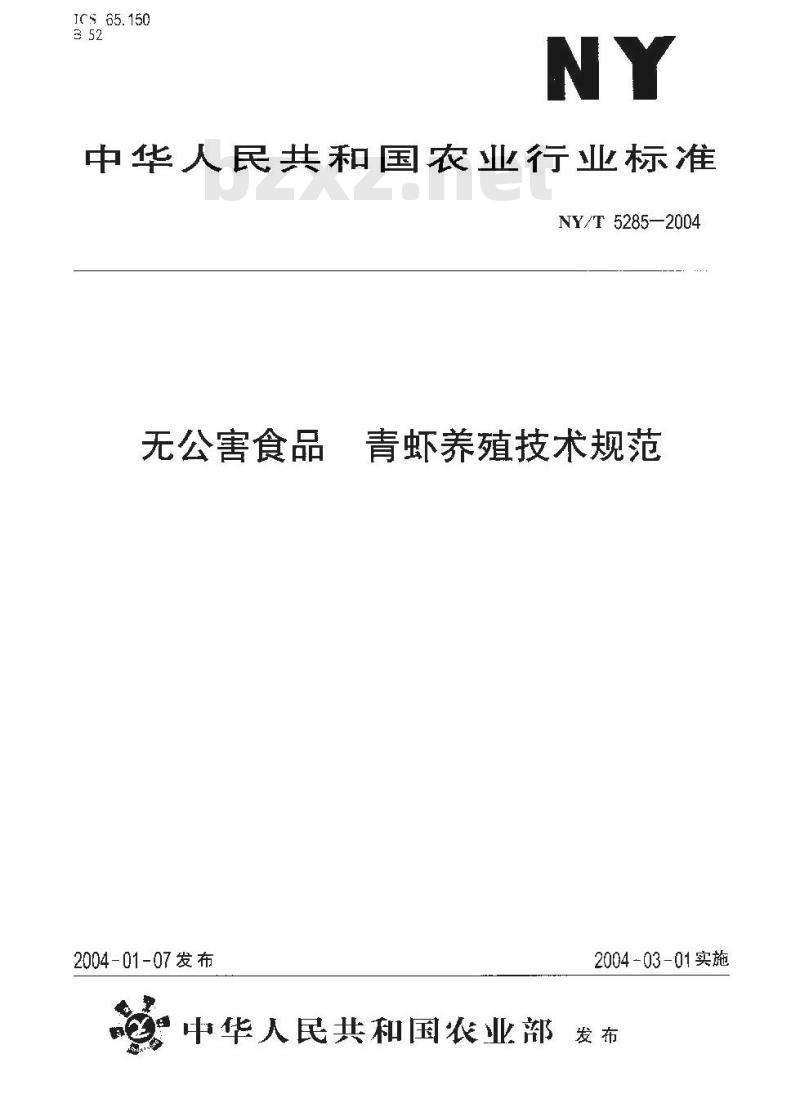 - NY/T 5285-2004 无公害食品 青虾养殖技术规范