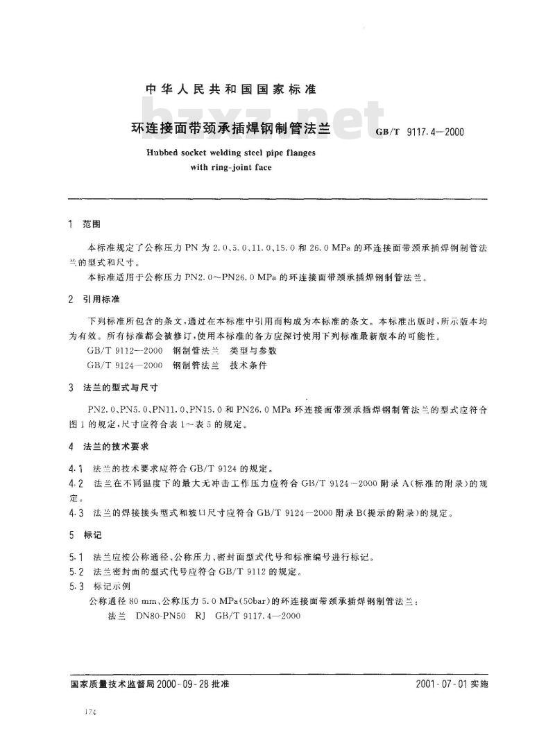 公称通径80mm、公称压力5.0MPa(50bar)的环连接面带颈承插焊钢制管法兰:法兰DN80-PN50RJGB/T 9117.4—2000国家质量技术监督局2000-09-28批准174
