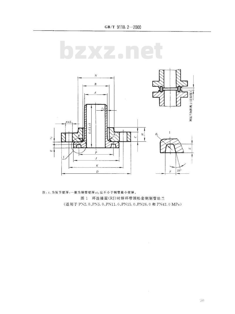 注:t 为短节壁厚,一般为钢管壁厚;t2应不小于钢管最小壁厚。图1环连接面(RJ)对焊环带颈松套钢制管法兰(适用于 PN2. 0、PN5. 0,PN11.0、PN15.0.,PN26.0 和 PN42. 0 MPa)189