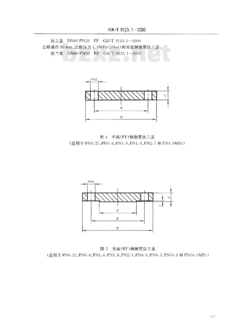 代替GB/T 9123.1~9123.16 1985本标准规定了公称压力PN为0.25、0.6、1.0、1.6、2.5、4.0、6.3、10.0、16.0MPa和公称力PN为2.0、5.0、11.0、15.0、26.0、42.0MPa的平面、突面钢制管法兰盖的型式和尺寸,本标准适用于公称压力PN0.25~PV42.OMPa的平面、突面钢制管法兰盖。2引用标准