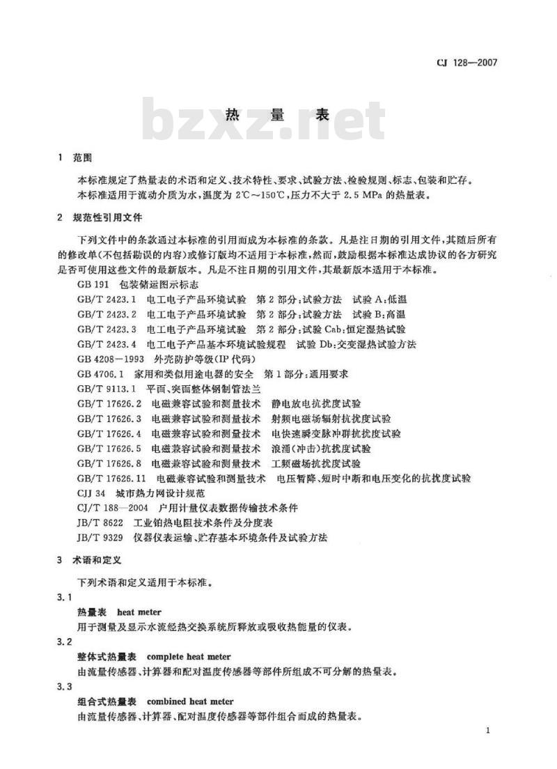 本标准自实施之日起代替《热量表》CJ 128-2000。本标准规定了热量表的术语和定义,技术特性,要求,试验方法,检验规则,标志,包装,贮存。本标准适用于流动介质为水,温度为2℃~150℃,压力不大于2.5MPa的热量表。 CJ 128-2007 热量表 CJ128-2007