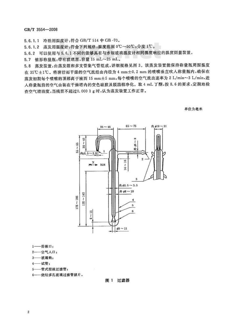 A.5.1将过滤管在浓盐酸中浸泡,并用蒸馏水清洗,接着用丙酮淋洗,然后置于空气中干燥,最后将其放在105℃的干燥烘箱中30min。A,5.2将清洁的过滤管浸泡在蒸馏水中润湿。A.5.3按图A.1所示安装仪器,可经压力调节器慢慢施加压力。A,5.4使过滤管的滤片刚好浸没在水表面下,滤片上的水层要尽量少。A.5.5升高空气压力到低于估计气泡穿过压力约1.33kPa,然后以0.40kPa/min的速度缓慢增压,直到第一个气泡穿过过滤管滤片,记下第一个气泡离开滤片时的压力。如果液面超过过滤管滤片表面,则必须从观察到的压力中扣除由液体产生的压力。GB/T3554—2008