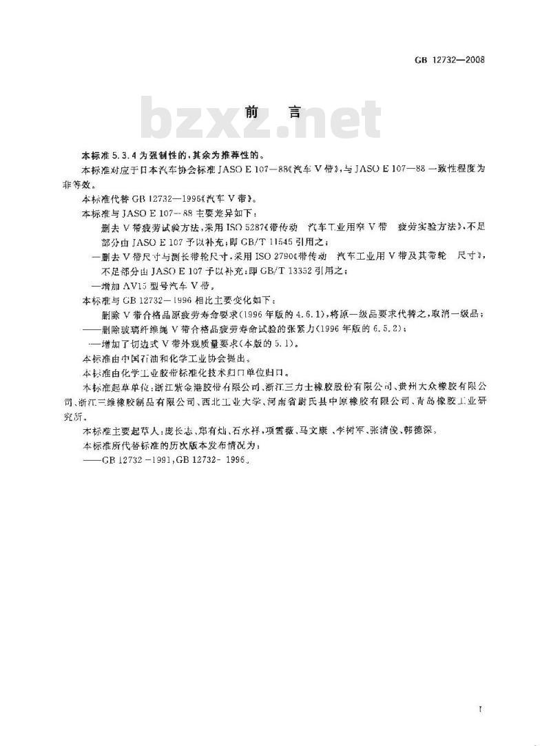 本标准代替GB12732—1996《汽车V带》。本标准规定了汽车V带产品的分类、材料、要求、抽样、试验方法及标志、标签、包装、贮存和运输的规则。本标准适用于驱动汽车内燃机的辅助设备(例如:风扇、发电机、水泵、压缩机、动力转向泵等)的汽车V带。本标准对应于日本汽车协会标准JASOE107—88《汽车V带》,与JASOE107—88一致性程度为非等效。 本标准所代替标准的历次版本发布情况为:——GB12732—1991,GB12732—1996。 GB 12732-2008 汽车V带 GB12732-2008