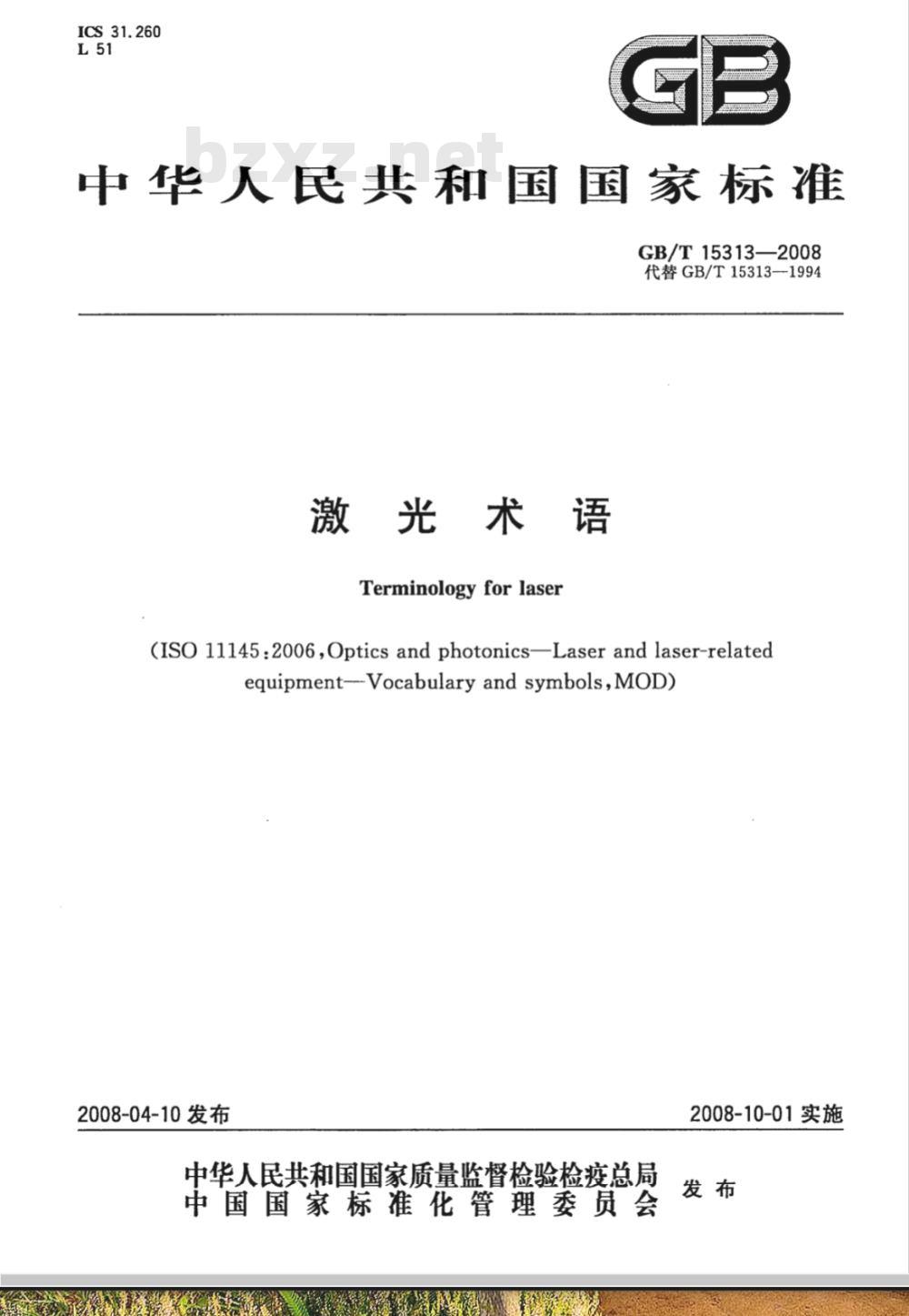 本标准代替GB/T15313—1994《激光术语》。本标准根据ISO11145:2006重新起草。本标准规定了激光基储激光技术、激光器件与材料、激光器和激光设备与应用的术语及其符号与单位。本标准适用于科研、生产和教学。 本标准与GB/T15313—1994相比,主要变化如下:———原国家标准中与ISO11145:2006标准相同的术语,按照ISO11145:2006的定义进行了修改与整理。———对原标准重点补充了:半导体激光器(量子阱激光器、量子点激光器、量子线激光器;垂直腔面发射器件;单条、叠层、堆积半导体激光器;直接泵浦技术);光纤激光器(光纤放大器、光纤光栅;双包层光纤、包层泵浦;光子晶体、光子晶体光纤);新材料和器件(掺铒玻璃;陶瓷激光材料、陶瓷激光器;钛宝石、钛宝石激光器;钒酸钇、钨酸钆钾…;漫反射聚光腔);强激光器(热容激光器;激光光束合成技术)等新发展的激光器术语和相关材料、器件及技术的术语。———2.5“激光设备与应用”为新增加部分,主要增加了激光加工、激光医疗、激光测量、激光印刷和激光信息应用等方面的术语,这部分术语应用面广,迫切需要明确技术内涵和术语统一。———标准中与ISO11145:2006对应的符号和单位,等同采用ISO11145:2006,其他符号和单位仍与前版标准一致,使符号和单位的使用保持连续性。———对国际标准术语laser[ISO111453.30]在等同采用的前提下,增加了激光器分类的内容,使术语的定义更加全面和深入。———对原标准中用名词定义名词的部分术语,应用技术内涵进行了重新定义,深化了术语定义的技术内涵。———本次修订新增加和补充术语121条,修改术语120条,未修改的术语38条。 GB/T 15313-2008 激光术语 GB/T15313-2008