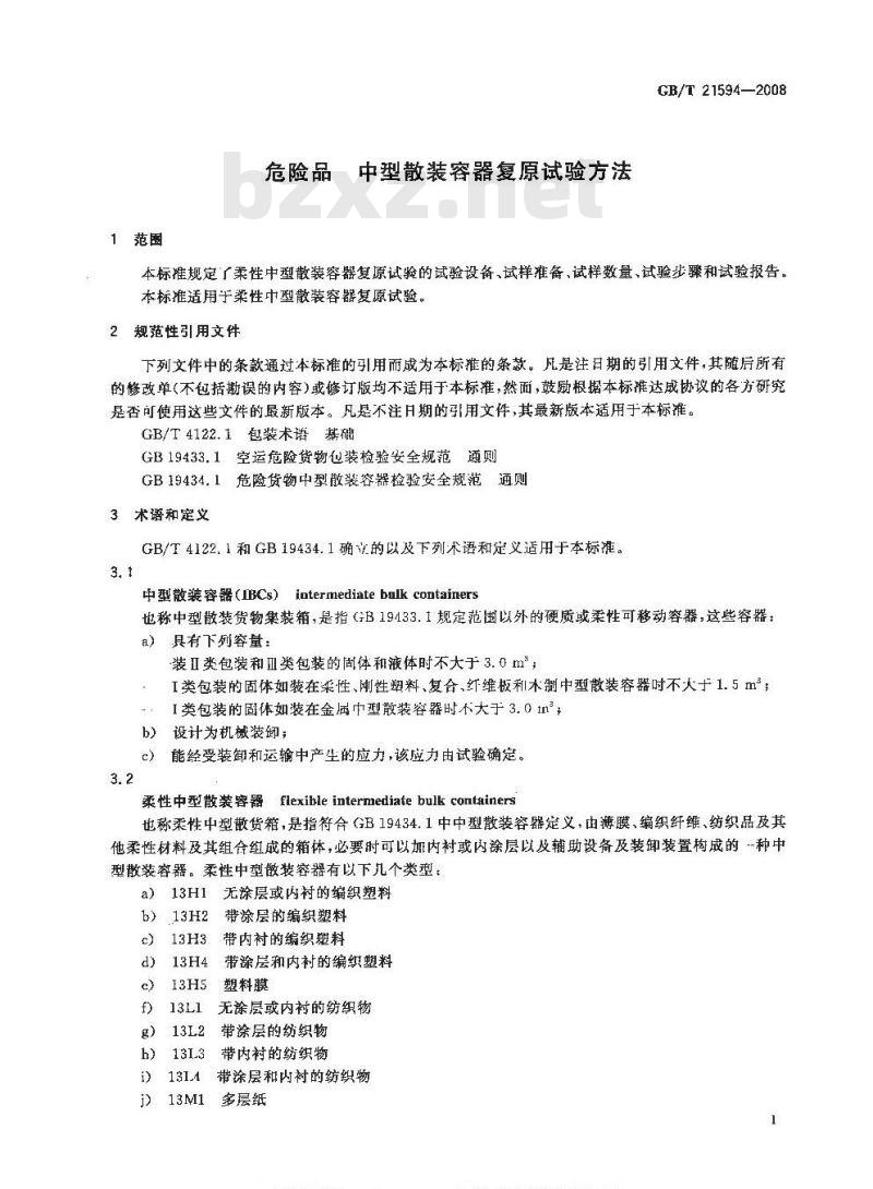 本标准为首次发布。本标准规定了柔性中型散装容器复原试验的试验设备、试样准备、试样数量、试验步骤和试验报告。本标准适用于柔性中型散装容器复原试验。 本标准对应于联合国《关于危险货物运输的建议书 规章范本》,与其一致性程度为非等效。其有关技术内容与上述手册完全一致,在标准文本格式上按GB/T1.1—2000做了编辑性修改。 GB/T 21594-2008 危险品 中型散装容器复原试验方法 GB/T21594-2008