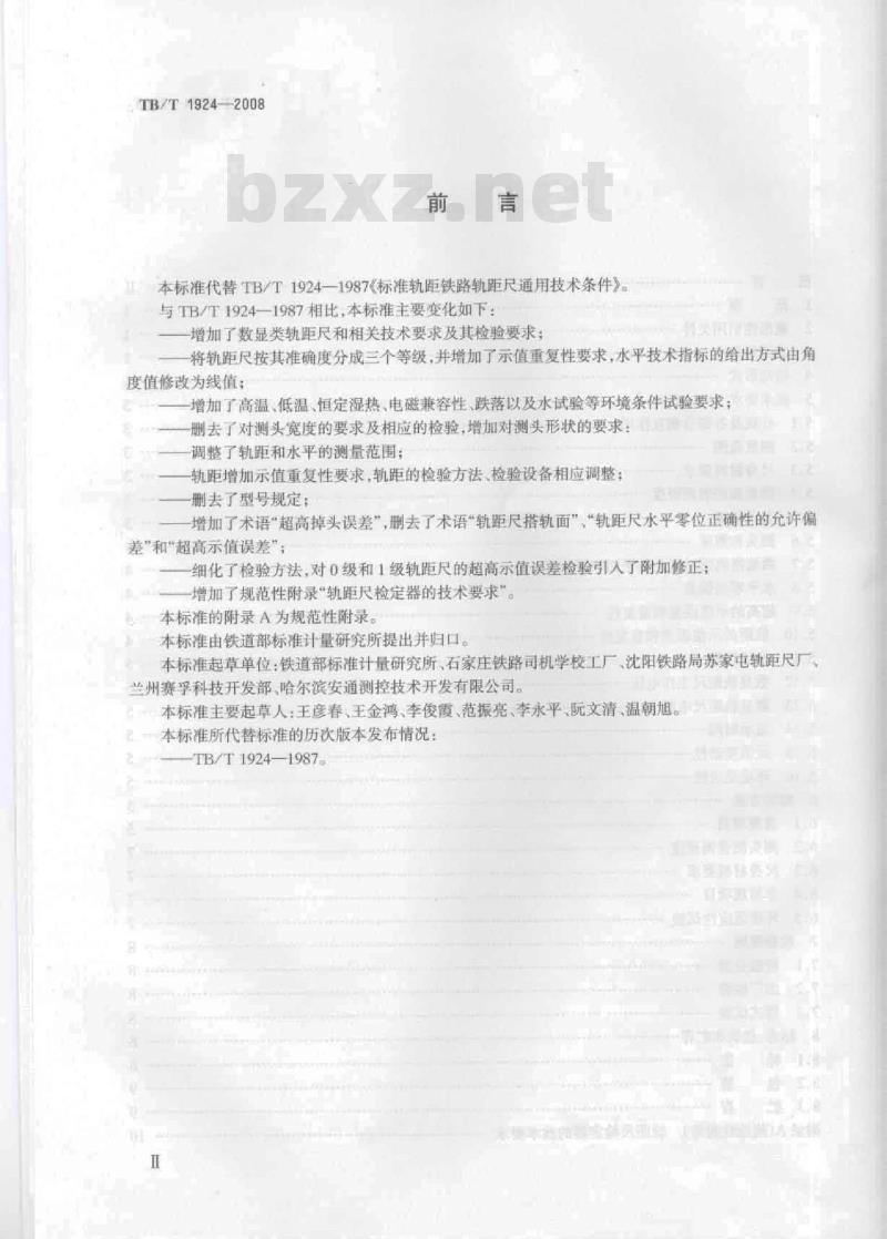 本标准由铁道部标准计量研究所提出并归口。本标准起草单位:铁道部标准计量研究所、石家庄铁路司机学校工厂、沈阳铁路局苏家电轨距尺厂兰州赛孚科技开发部、哈尔滨安通测控技术开发有限公司。本标准主要起草人:王彦春、王金鸿、李俊霞、范振亮、李永平、阮文清、温朝旭。本标准所代替标准的历次版本发布情况:TB/T1924-1987
