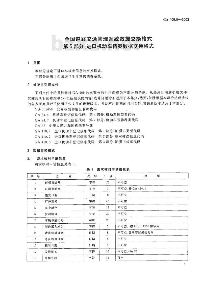 GA409《全国道路交通管理系统数据交换格式》分为5部分:第1部分:机动车驾驶员数据交换格式;第2部分:机动车登记数据交换格式;第3部分:交通违章数据交换格式;第4部分:交通事故统计数据交换格式;第5部分:进口机动车档案数据交换格式。本部分为GA409的第5部分。