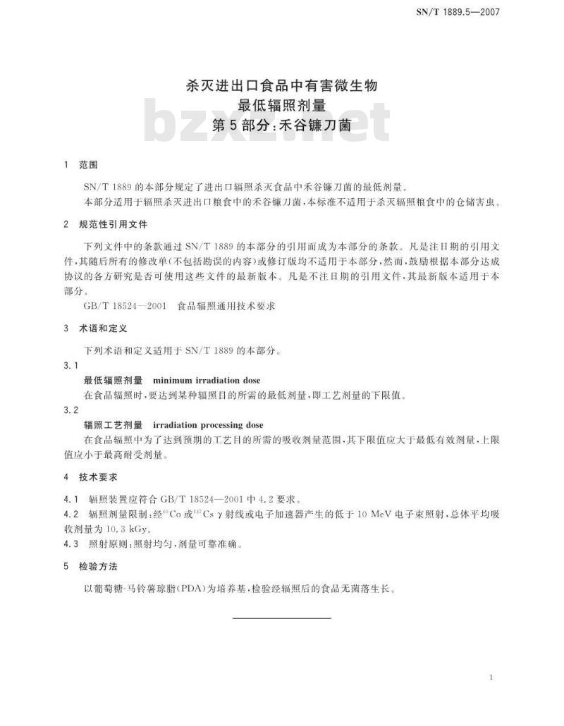 SN/T1889的本部分规定了进出口辐照杀灭食品中禾谷镰刀菌的最低剂量。SN/T1889.5—2007