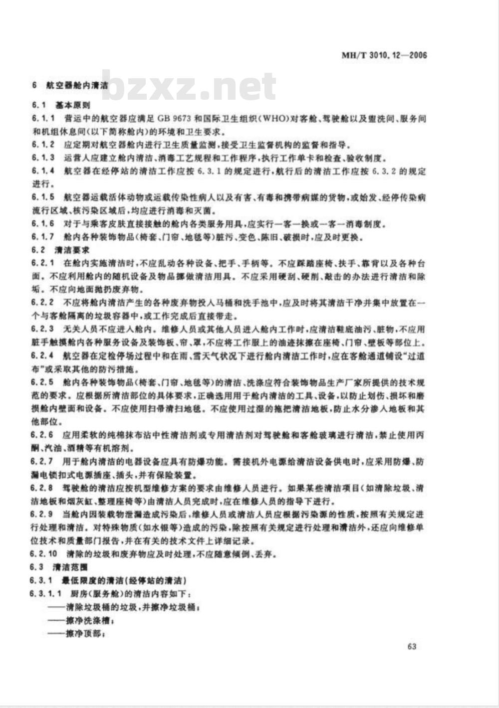 6.1.1营运中的航空器应满足GB9673和国际卫生组织(WHO对客舱、驾驶舱以及塑洗间、服务间和机组休息间(以下简称舱内)的环境和卫生要求,6.1.2应定期对航空器舱内进行卫生质量监测,接受卫生监督机构的监督和指导。6.1.3运营人应建立舱内清洁、消毒工艺规程和工作程序,执行工作单卡和检查、验收制度。6.1.4航空器在经停站的清洁工作应按6.3.1的规定进行,航行后的清洁工作应按6.3.2的规定进行。