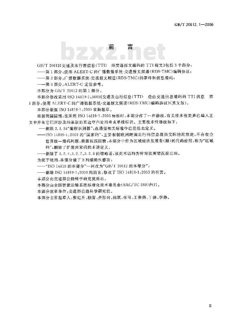 本部分修改采用[SO14819-1:2003交通及出行信总(TTI)经由交通信息编码的TTI信息第1部分:使用AI.FRT-C的广播数据系统-交通报文频道(RDS-TMC)编码协议》(英文版)。本部分银据IS014819-12003重新起草,根据我国国情,在采用ISC14819-1:2003标准时,本部分作了一些修改,有关技术性差异已编人正文中并在它们所涉及的条款的页边空处用乘直单线标识。主要技术性修改如下:一删除3.1.14“编程识别器”,在通信相关标准中已经给出定义。-1S014819-1:2003的\国家码”,主要根据欧洲跨国出行的信息提供实际况制定,不存在全世界统一编码问题,根据我国国情,本部分作为区域经济发展带(圈)的代码使用,称为区域码”:删除了扩展国家码的术语定义,删除了3.2.4,3.2.7,3.2.8的缩略语,该类术讲均为针对欧洲情况提出的。为便于使用,本部分做了下列编辑性修改:_\[S014819的本部分一间改为\GB/T20612的本部分”;—删除1S0 14819-1:2003 的前言,修收了ISO 14819-1:2003的引言。本部分由交部公路科学研究院提出:本部分由全国智能运输系统标准化技术委员会(SAC/TC268)归口。本部分起革单位:交通部公路科学研究院。本部分主要起草人:张纪升、柏背、齐彤岩、杨琪,张可、工春燕,丁捷、李静。GB/F20612.1—2006