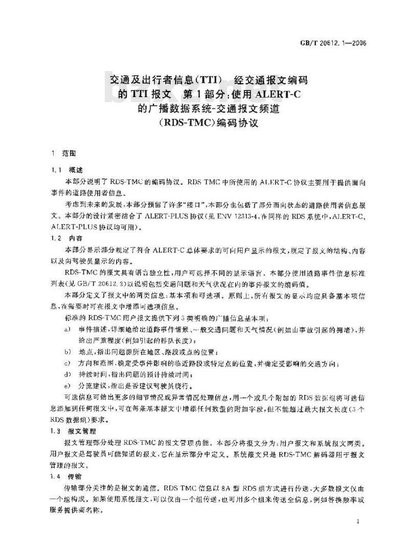 本标准规定了符合ALERT-C总体要求的可向用户显示的报文,规定了报文的结构、内容以及向驾驶员显示的内容;适用于智能交通系统的信息交换。 GB/T 20612.1-2006 交通及出行者信息(TTI) 经交通报文编码的TTI报文 第1部分:使用ALERT-C的广播数据系统-交通报文频道(RDS-TMC)编码协议 GB/T20612.1-2006