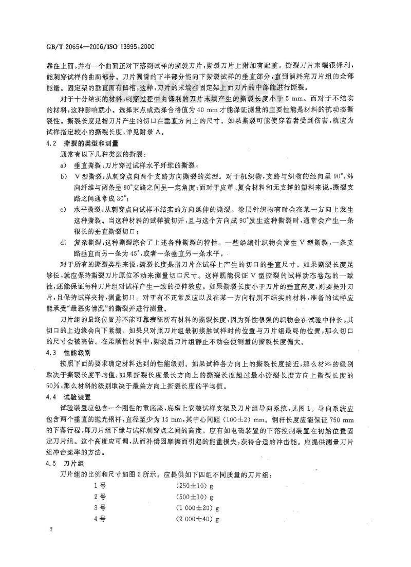 GB/T20654—2006/ISO 13995:2000靠在上面,并有一个曲面正对下落到试样的撕裂刀片,撕裂刀片上附加有配重。撕裂刀片末端很锋利,能刺穿试样的曲面部分。刀片圆滑的下半部分能向下撕裂试样的垂直部分,直到消耗完刀片组的全部能量。固定架的垂直面有凹槽,这样,刀片的末端在固定架上而刀片的中部能进行撕裂。对于十分结实的材料,刺穿过程中由锋利的刀片末端产生的撕裂长度小于5mm。而对于不结实的材料,这种影响就小。选择末点或选择合格值为40mm才能保证测量的主要性能是材料的抗动态撕裂性。撕裂长度是指刀片产生的切口在垂直方向上的尺寸。如果撕裂可能使穿着者受到伤害,就应为试样指定较小的撕裂长度,详见附录A。4.2撕裂的类型和测量