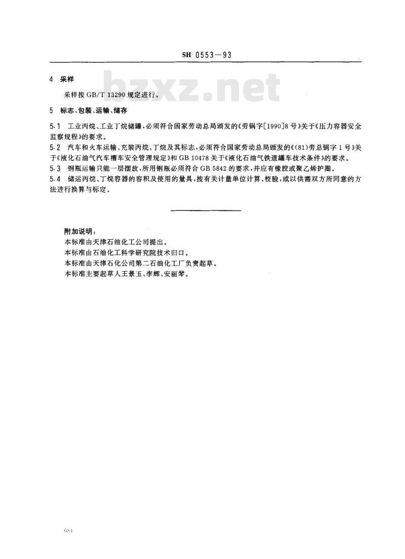 本标准规定了由炼厂气经脱硫、分离而制得工业丙烷、工业丁烷产品的技术条件。工业丙烷产品主要用于金属零件淬火、渗碳的保护气、与丁烷混合做雾化荆、脱沥青溶剂及高热值燃料。工业丁烷产品主要用作玻壳加工、机械制造业、纺织印染业的高热值燃料、打火机专用气及化工发泡剂。 SH 0553-1993 工业丙烷、丁烷 SH0553-1993