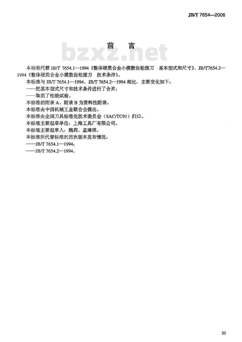 本标准代替JB/T7654.1—1994《整体硬质合金小模数齿轮滚刀1基本型式和尺寸》、JB/T7654.21994《整体硬质合金小模数齿轮滚刀技术条件》。本标准与JB/T7654.1—1994、JB/T7654.2--1994相比,主要变化如下:把基本型式尺寸和技术条件进行了合并:取消了性能试验。