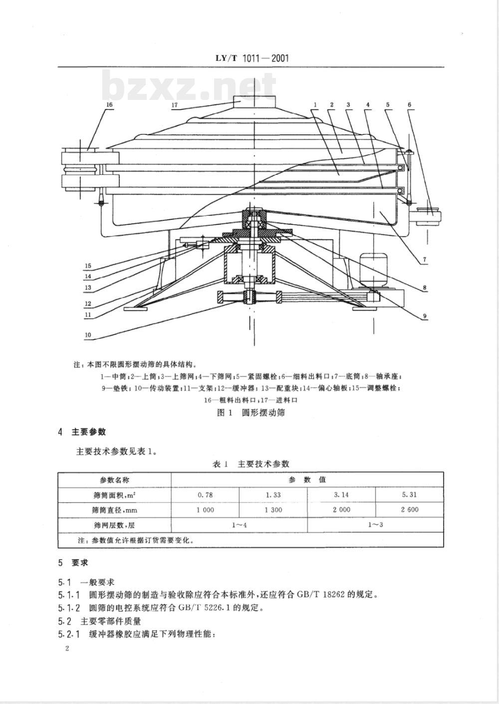 5.1.1圆形摆动筛的制造与验收除应符合本标准外,还应符合GB/T18262的规定。5.1.2圆筛的电控系统应符合GB/T5226.1的规定。5.2主要零部件质量