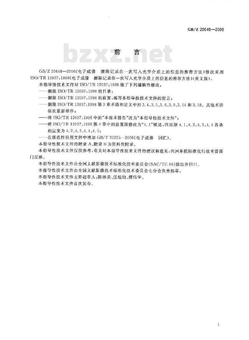 GB/Z20648一2006《电子成像擦除记录在一次写人光学介质上的信息的推荐方法》修改采用ISO/TR12037.1998《电子成像擦除记录在一次写入光学介质上的信息的推荐方法》(英文版)。本指导性技术文件对ISO/TR12037:1998做了下列编辑性修改:删除ISO/TR12037:1998的月录;删除ISO/TR12037:1998的前言,编写本指导性技术文件的前言;删除ISO/TR12037:1998第3章术语和定义中的3.4、3.5、3.6、3.9.3.14和3.18。其他术语依次重新排序: