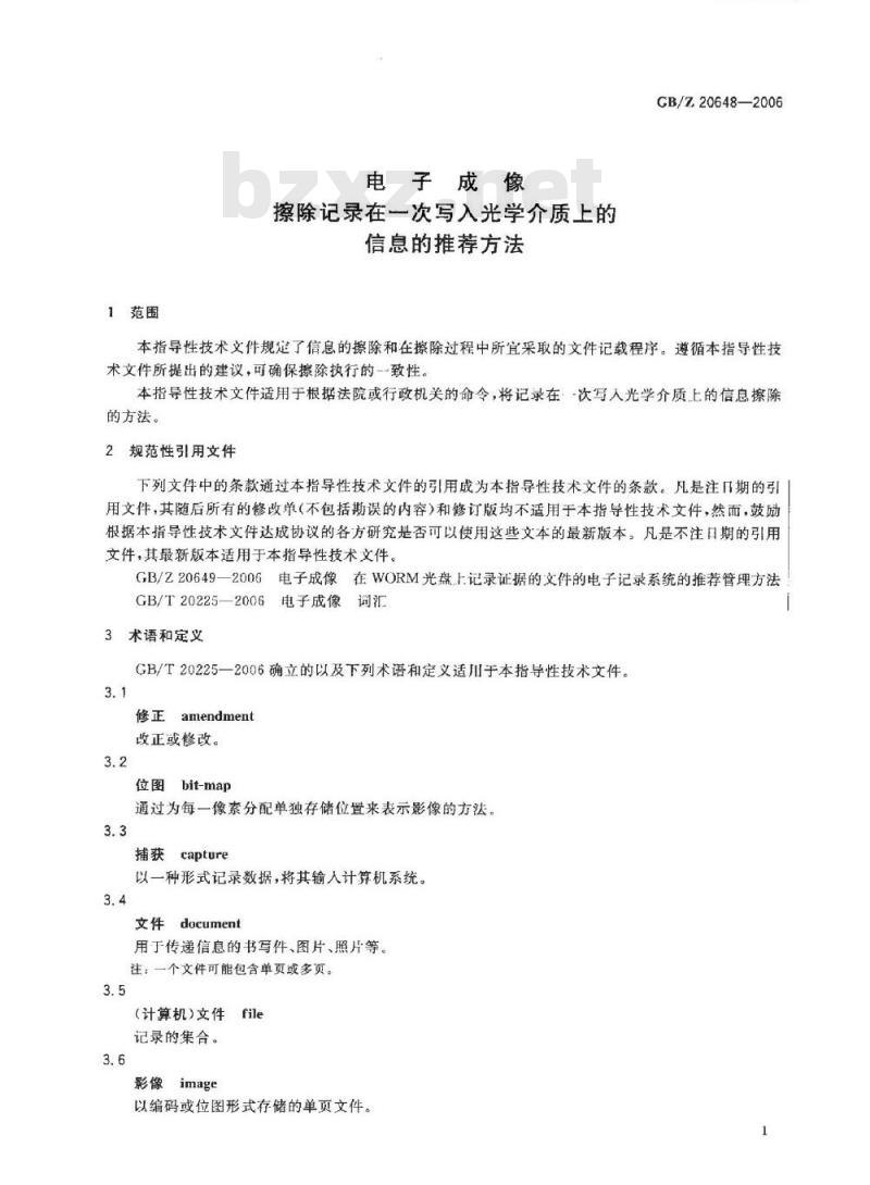 下列文件中的条款通过本指导性技术文件的引用成为本指导性技术文件的条款。凡是注口期的引用文件,其随后所有的修改单(不包括勘误的内容)和修订版均不适用于本指导性技术文件,然而,鼓励根据本指导性技术文件达成协议的各方研究是否可以使用这些文本的最新版本。凡是不注日期的引用文件,其最新版本适用于本指导性技术文件。GB/Z20649一200G电子成像在WORM光盘上记录证据的文件的电子记录系统的推荐管理方法GB/T20225—2006电子成像词汇