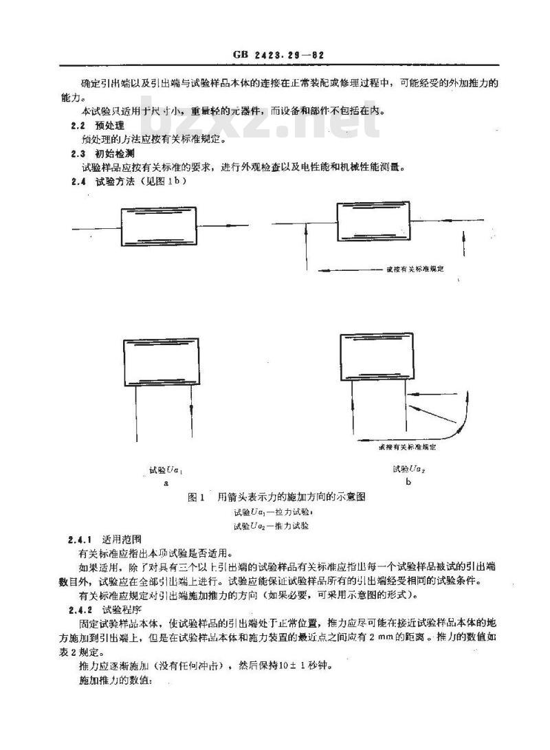 如果适用,除了对具有三个以上引出端的试验样品有关标准应指山每一个试验样品被试的引出端数自外,试验应在全部引出端上进行。试验应能保证试验样品所有的引出端经受相同的试验条件。有关标准应规定对引出端施加推力的方向(如果必要,可采用示意图的形式)。2.4.2试验程序
