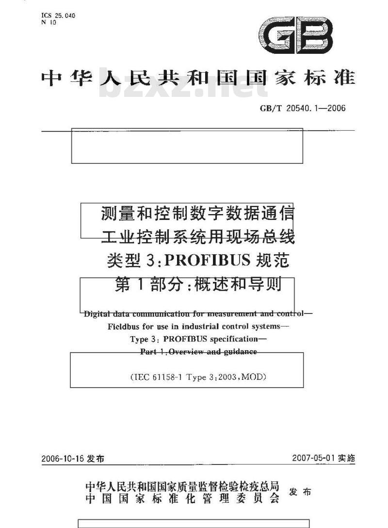 Digital data commumicatiou for measurement and control-Fieldbus for use in industrial control systems-Type 3: PROFIBUS specification-Part l : Overview and guidanee(IEC 61158-1Type 3:2003,M0D)2006-10-16发布