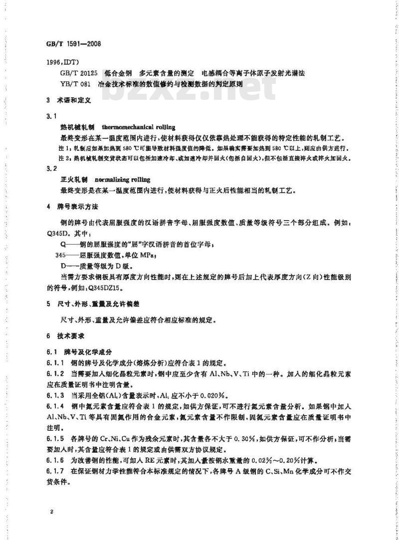 本标准规定了低合金高强度结构钢的牌号、尺寸、外形、重量及允许偏差、技术要求、试验方法、检验规则、包装、标志和质量证明书。本标准适用于一般结构和工程用低合金高强度结构钢钢板,钢带、型钢、钢棒等。2规范性引用文件