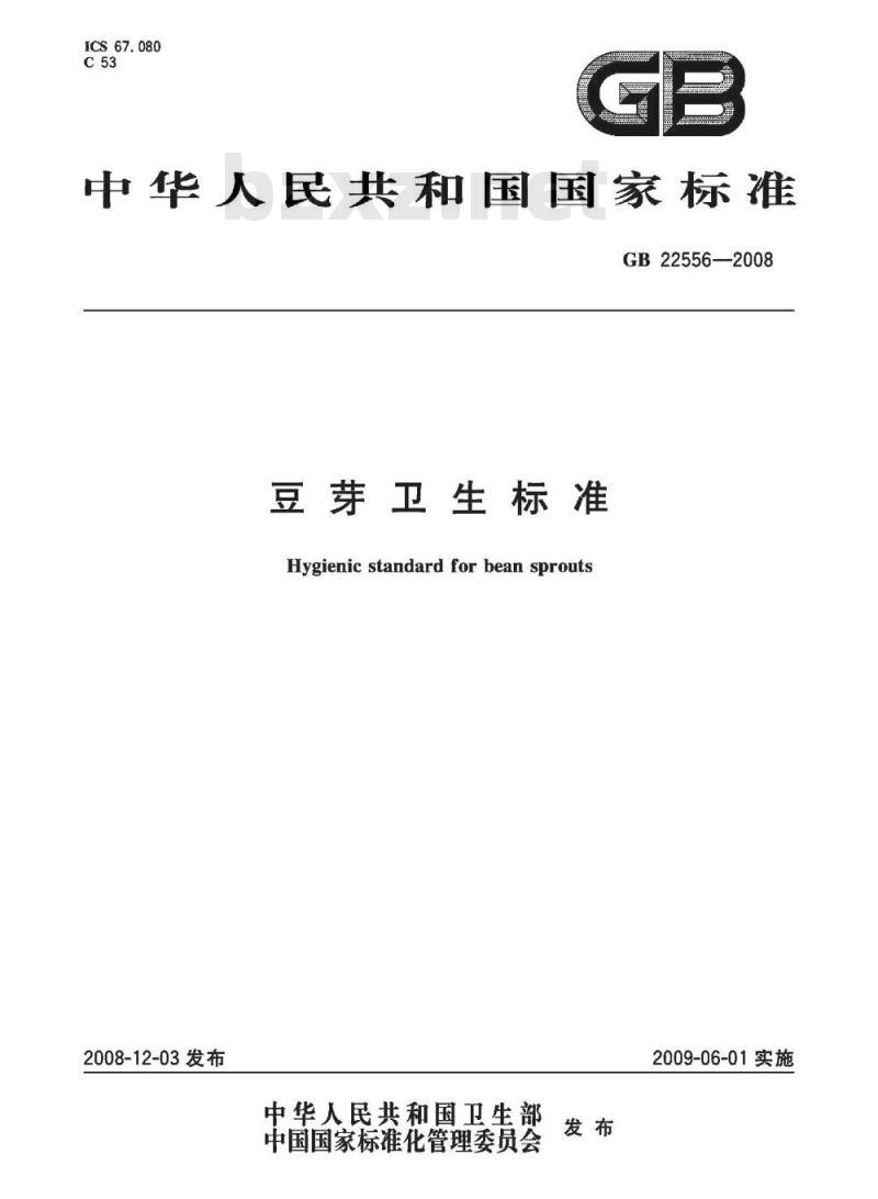 本标准规定了豆芽的指标要求、食品添加剂、生产加工过程的卫生要求、包装、标识、贮存及运输和检验方法。本标准适用于以大豆或绿豆为原料,经生产加工而成的豆芽。 GB 22556-2008 豆芽卫生标准 GB22556-2008