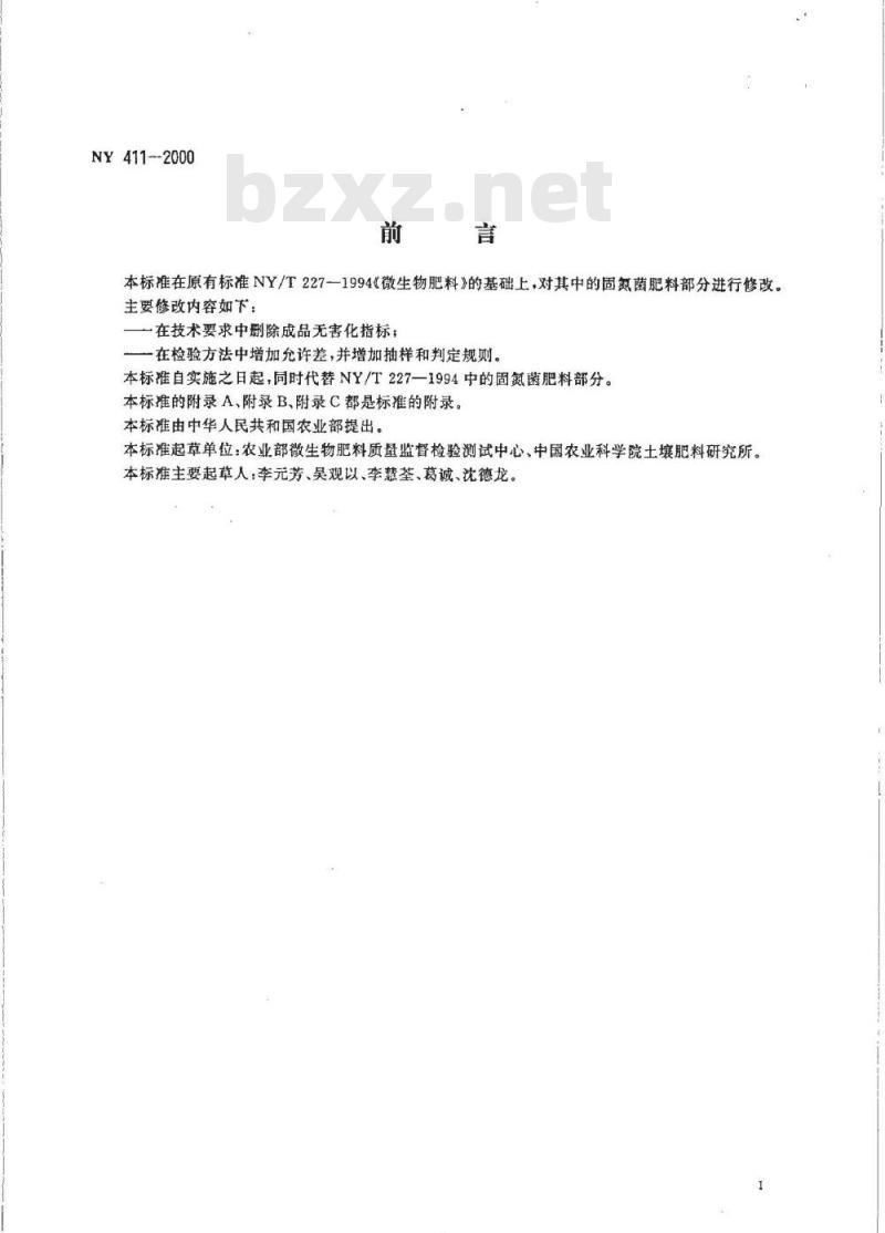 一在技术要求中删除成品无害化指标;一在检验方法中增加允许差,并增加抽样和判定规则。本标准自实施之日起,同时代替NY/T227一1994中的固氮菌肥料部分。本标准的附录A、附录B、附录C都是标准的附录。本标准由中华人民共和国农业部提出。本标准起草单位:农业部微生物肥料质量监督检验测试中心、中国农业科学院土壤肥料研究所。本标准主要起草人:李元芳、吴观以、李慧荃、葛诚、沈德龙。1范围