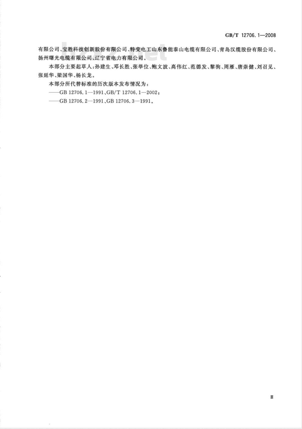 本部分与GB/T12706.1一2002相比,主要变化如下:适用范围增加了无卤低烟阻燃电缆品种(本版第1章);增加了外护套材料无卤混合料(ST:)代号及其最高导体运行温度(本版表4);增加了对无卤低烟阻燃电缆的绝缘的要求(本版6.1);—增加了对无卤低烟阻燃电缆的内衬层和填充的要求(本版7.1.2);—增加了铜带的技术要求(本版9.2.3);—增加了钢带的技术要求(本版12.2);—增加了对隔离套的火花试验要求(本版12.3.3);—增加了对无卤低烟阻燃电缆的隔离套的要求(本版12.3.3);—增加了对外护套的火花试验要求(本版13.1);一增加了对无卤低烟阻燃电缆的外护套的要求(本版13.2);修改了对非金属护套厚度的要求(2002年版16.5.3;本版的16.5.3);增加了ST:无卤护套混合料的机械性能试验(本版18.4);—增加了STs无卤护套混合料的特殊性能试验(本版18.8,18.22);增加了STs无卤护套电缆成束燃烧试验(本版18.14.2);一增加了ST:无卤护套电缆的烟发散试验、酸气含量、pH值和电导率试验、氟含量试验和毒性指数试验(本版18.14.3,18.14.4,18.14.5,18.14.6,18.14.7);-增加了STs无卤护套的附加机械性能试验(本版18.21);修改了电缆安装后电气试验的要求(2002年版第19章;本版的第19章);修改了ST,护套混合料的机械性能老化时间(2002年版表16;本版的表18);—增加了ST:无卤护套混合料的机械性能试验要求(本版表18);修改了ST,护套混合料的高温压力试验温度(2002年版表18;本版的表20);一增加了ST:无卤护套混合料的特殊性能试验(本版表21);一增加了无卤混合料的试验方法和要求(本版表23);——增加了五芯电缆成缆线芯假设直径计算公式(本版A.2.3);一删除了2002年版的附录D、附录E、附录F和附录G,并将其内容归并到本版的附录D中;—增加了规范性附录“电缆产品的补充条款”(本版附录D);—增加了第5种铜导体代号(本版D.1.2.1.1);——删除了挡潮层聚乙烯护层代号(2002年版附录D);修改了非磁性金属带的规定(2002年版附录D,本版D.1.2.1.4);-修改了内护层代号的规定(2002年版附录D,本版图D.1);增加了聚烯烃护套代号的规定(本版D.1.2.1);一增加了阻燃电缆的产品表示方法(本版D.1.2.2.1);增加了中性线和保护线导体的标称截面规定(本版表D.2)。本部分的附录A、附录B、附录C和附录D为规范性附录。本部分由中国电器工业协会提出。本部分由全国电线电缆标准化技术委员会(SAC/TC213)归口。本部分负责起草单位:上海电缆研究所。本部分参加起草单位:上海特缆电工科技有限公司、昆明电缆有限公司、黑龙江沃尔德电缆有限公司、广东电缆厂有限公司、福建南平太阳电缆股份有限公司、海南威特电气集团有限公司、上海华普电缆I