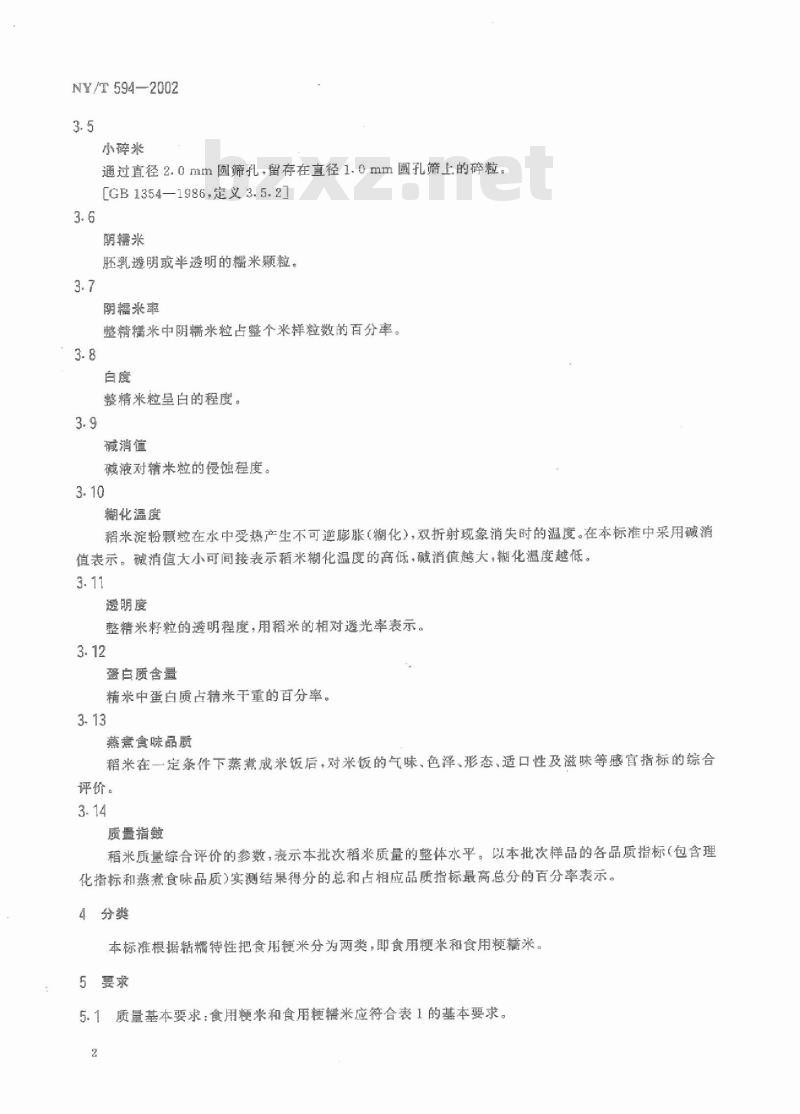 本标准规定了食用粳米的有关定义、分类、要求、试验方法和检验规则及包装、运输、贮存的要求。本标准适用于生产、加工、贮运、购销、进出口及科研等过程中对食用粳米的检验、评价和鉴定。本标准不适合用于食品、酿造等工业用的原料粳米。 NY/T 594-2002 食用粳米 NY/T594-2002