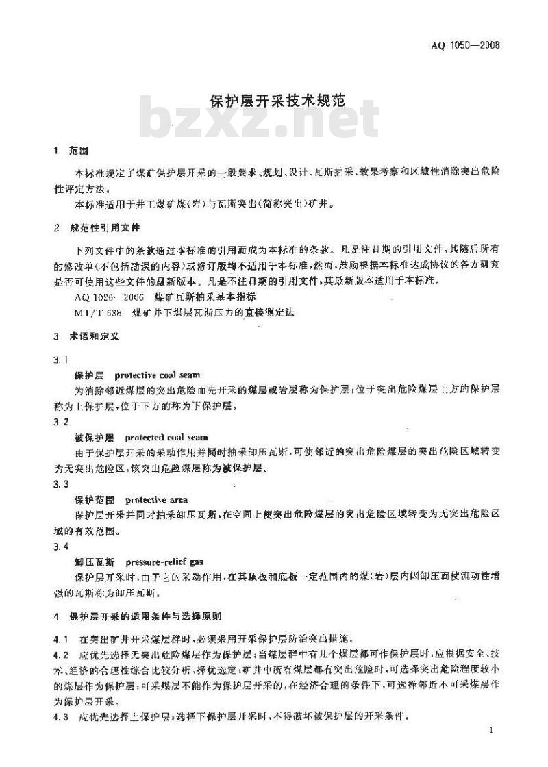 本标准规定了煤矿保护层开采的一般要求、规划、设计、瓦斯抽采、效果考察和区域性消除突出危险性评定方法。本标准适用于井工煤矿煤(岩)与瓦斯突出矿井。 AQ 1050-2008 保护层开采技术规范 AQ1050-2008