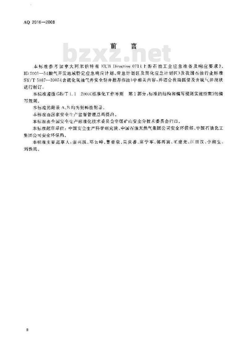 本标准遵循GB/T 1.1-2008《标准化工作导则 第1部分:标准的结构和编写规则实施指南》的编写规则。本标准规定了陆上含硫化氢天然气井井口失控时确定井口点火条件、点火时间应遵循的基本准则。本标准适用于陆上含硫化氢天然气井的失控井口点火处置。 AQ 2016-2008 含硫化氢天然气井失控井口点火时间规定 AQ2016-2008