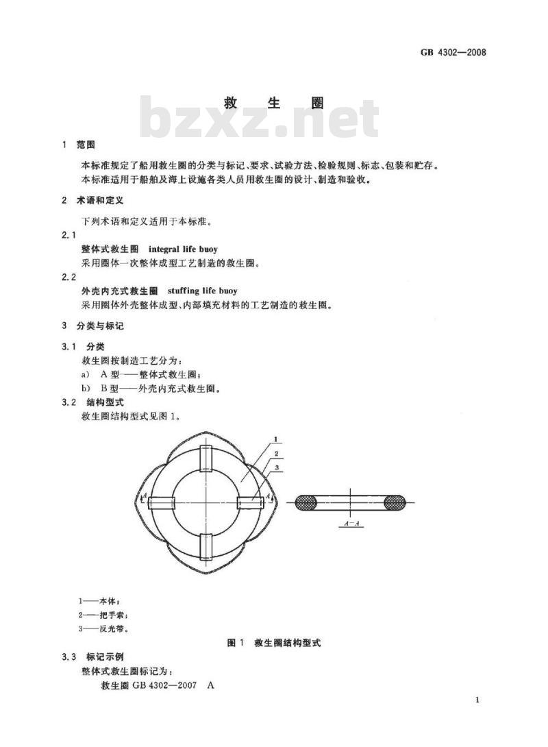 采用圈体外壳整体成型、内部填充材料的工艺制造的救生圈。3分类与标记