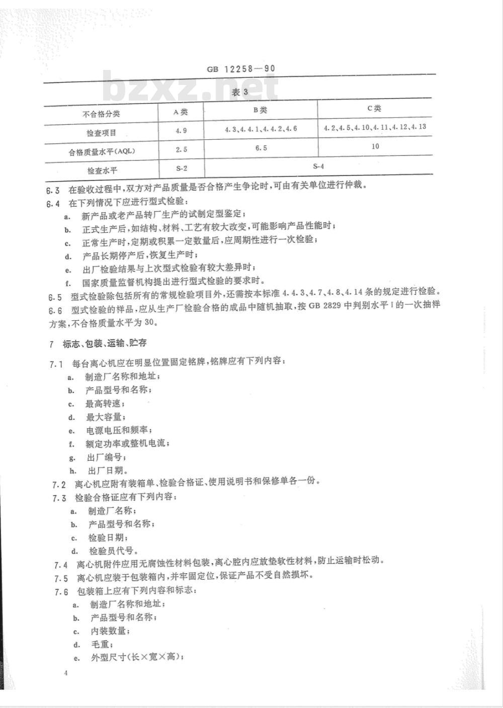6.1离心机由制造厂质量检验部门进行检验,合格后方可提交验收。6.2逐批检查采用一次抽样方法,最初检查为正常检查,抽样和检查应符合GB2828的规定。不合格分类、检查项目、合格质量水平和检查水平按表3的规定。3