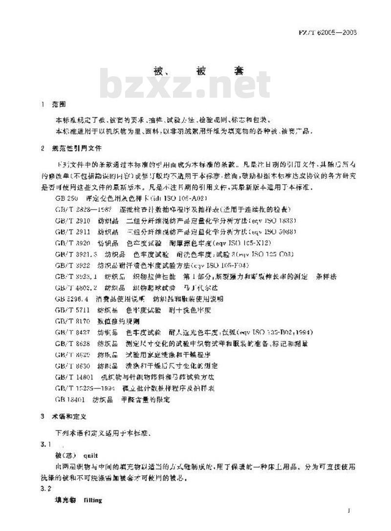 本标准规定了被、被套的要求、抽样、试验方法、检验规则、标志和包装。本标准适用于以机织物为里、面料,以非羽绒絮用纤维为填充物的各种被、被套产品. FZ/T 62005-2003 被、被套 FZ/T62005-2003