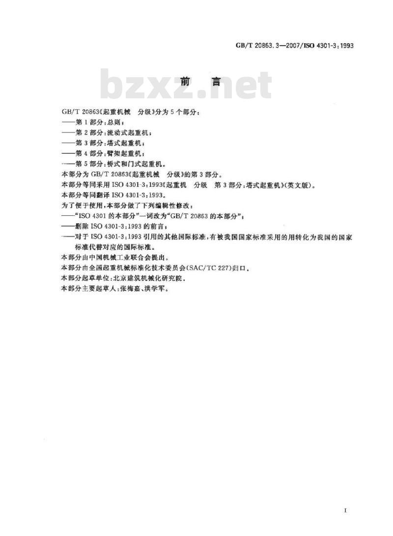 本部分为GB/T20863《起重机械分级》的第3部分。GB/T20863.3—2007/ISO4301-3:1993本部分等同采用ISO4301-3:1993《起重机分级第3部分:塔式起重机》(英文版)。本部分等向翻译ISO4301-3:1993。为了便于使用,本部分做了下列编辑性修改:“ISO4301的本部分”一词改为“GB/T20863的本部分”,删除ISO4301-3:1993的前言;