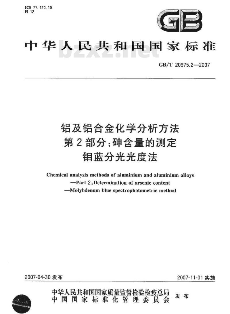 - GB/T 20975.2-2007 铝及铝合金化学分析方法 第2部分:砷含量的测定 钼蓝分光光度法