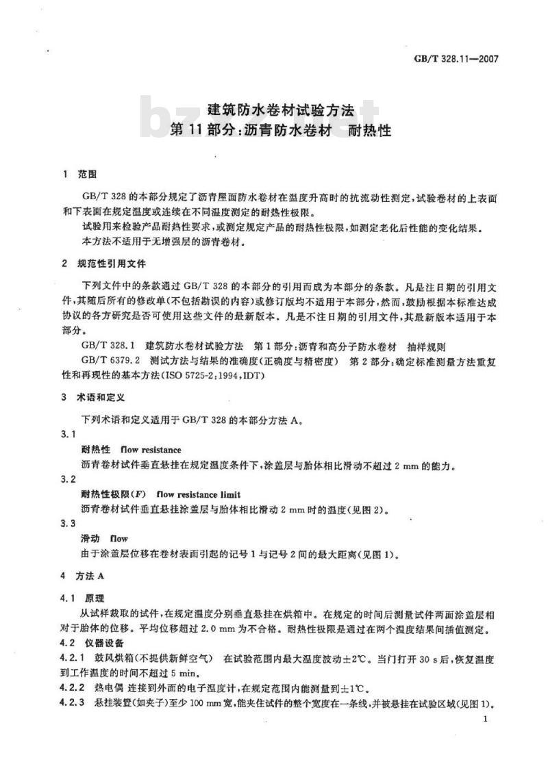 GB/T328的本部分规定了沥青屋面防水卷材在温度升高时的抗流动性测定,试验卷材的上表面和下表面在规定温度或连续在不同温度测定的耐热性极限。试验用来检验产品耐热性要求,或测定规定产品的耐热性极限,如测定老化后性能的变化结果。本方法不适用于无增强层的沥青卷材。2规范性引用文件