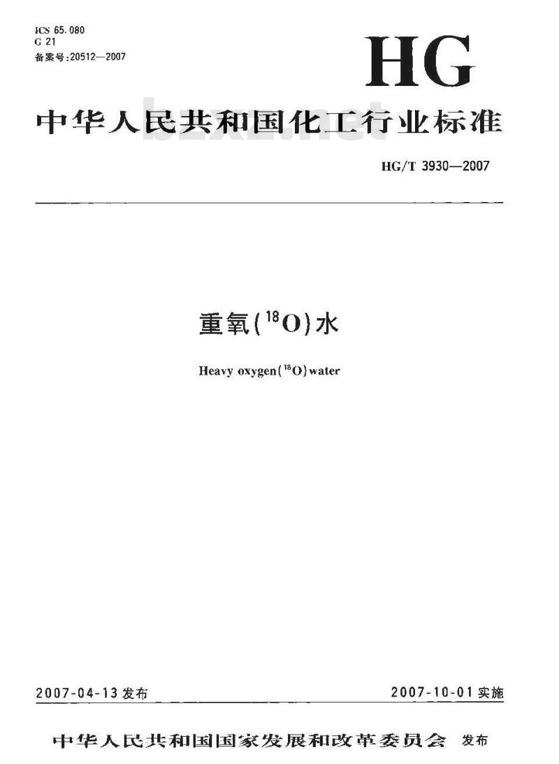本标准规定了重氧(18O)水产品的技术要求,试验方法、检验规则、标识、包装、运输和贮存等。本标准适用于通过水精馏法所制得的重氧(18O)水。 HG/T 3930-2007 重氧(18O)水 HG/T3930-2007