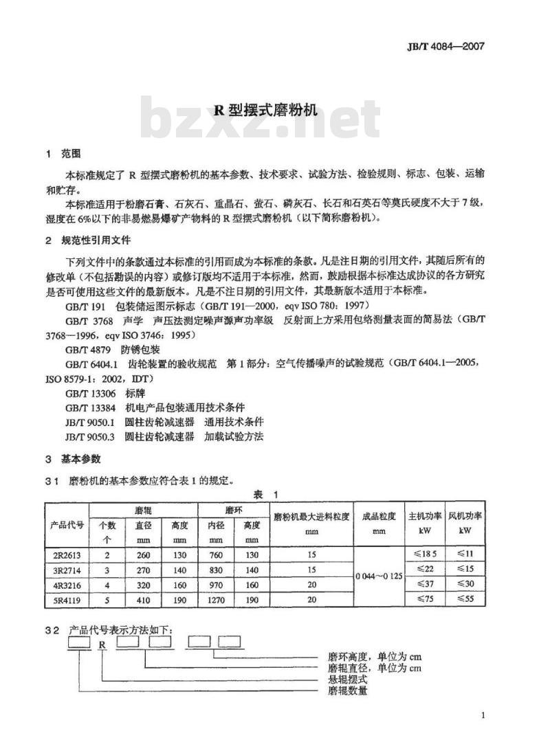 本标准代替JB/T4084—1991《R型摆式磨粉机》。本标准与JB/T4084-1991相比,主要变化如下:-增加了2R2613规格。