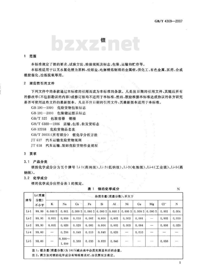 本标准规定了锂的要求、试验方法、检验规则及标志、包装、运输和贮存等。GB/T4369-—2007