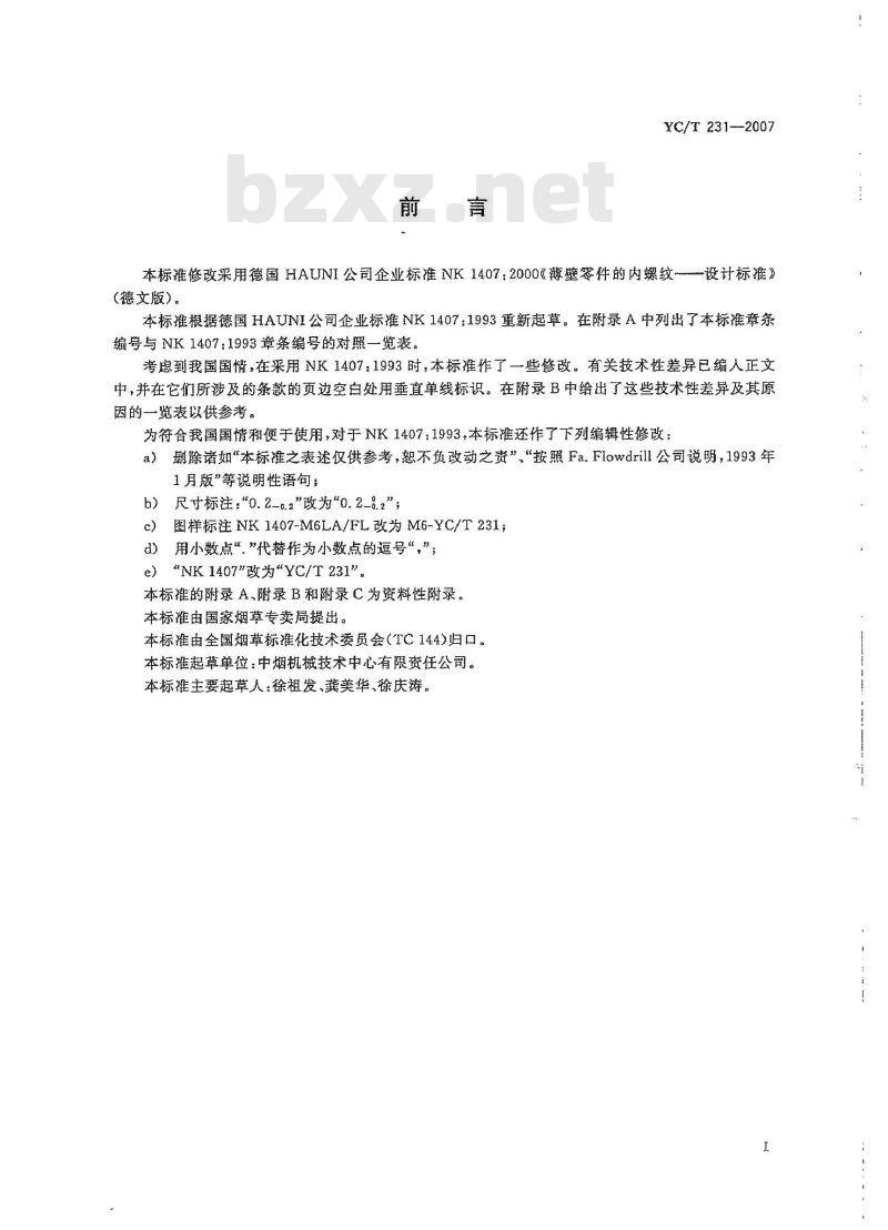 b)尺寸标注:“0.2-0.2\改为0.2-.2”;图样标注NK1407-M6LA/FL改为M6-YC/T231;d)用小数点“\代替作为小数点的逗号“,”e)“NK1407\改为\YC/T231。本标推的附录A,附录B和附录C为资料性附录。本标准由国家烟草专卖局提出。本标准由全国烟草标准化技术委员会(TC144)归口。本标推起草单位:中烟机械技术中心有限责任公司。本标推主要起草人:徐祖发、龚美华、徐庆涛。I
