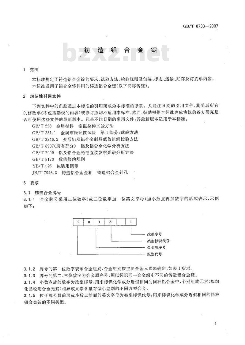 3.1.2牌号的第一位数字表示合金组别,合金组别按主要合金元素米确定,如表1所示。3.1.3牌号的第二、三位数字为合金顺序号,用以标识同一合金组中不同的铸造铝合金锭。3.1.4小数点后的数字为改型序号,用米标识化学成分近似相同的同种铝合金中,个别组成元索(如细化晶粒用合金元索)相异或元素含量有微小差别的不同改型合金。3.1.5位于牌号最前面或小数点前面的英文字母为类型标识代号,用来标识化学成分近似相同的同种铝合金锭的不同类型。