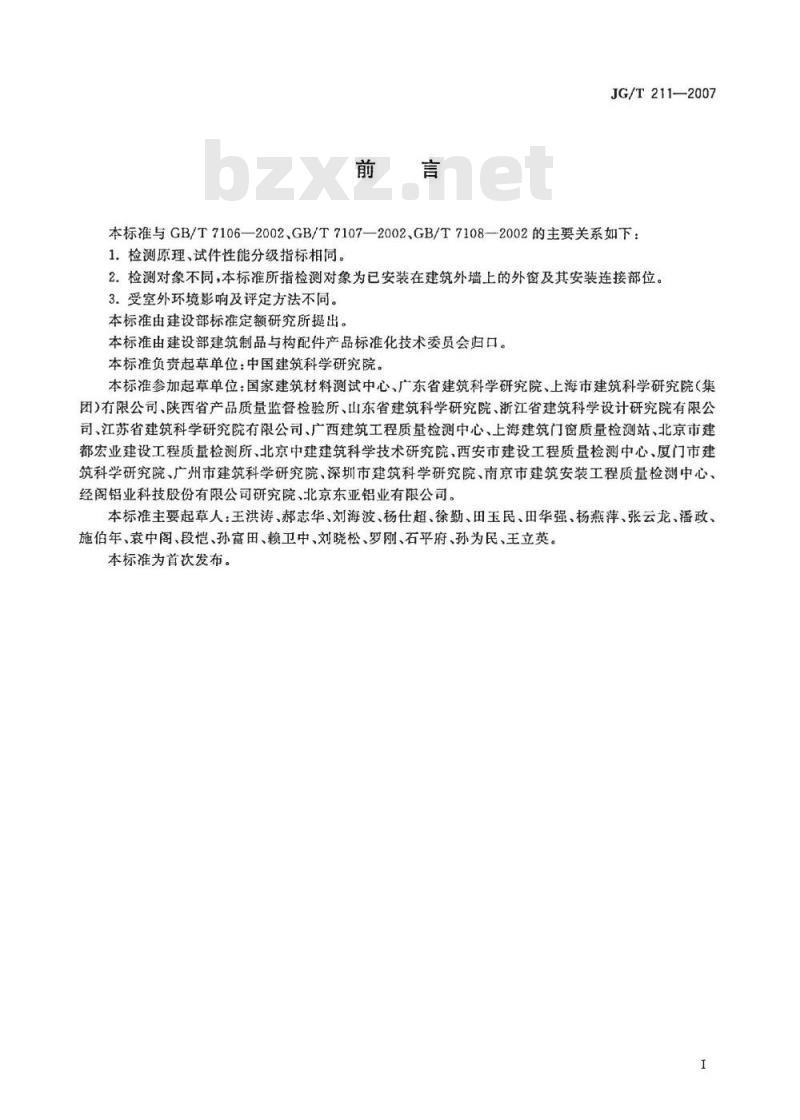 本标准与GB/T7106—2002、GB/T7107—2002、GB/T7108—2002的主要关系如下:1.检测原理、试件性能分级指标相同。2.检测对象不同,本标准所指检测对象为已安装在建筑外墙上的外窗及其安装连接部位。3.受室外环境影响及评定方法不同。本标准由建设部标准定额研究所提出。本标准由建设部建筑制品与构配件产品标准化技术委员会归口。本标准负责起草单位:中国建筑科学研究院。本标准参加起草单位:国家建筑材料测试中心广东省建筑科学研究院、上海市建筑科学研究院(集团)有限公司、陕西省产品质量监督检验所、山东省建筑科学研究院、浙江省建筑科学设计研究院有限公司、江苏省建筑科学研究院有限公司、广西建筑工程质量检测中心、上海建筑门窗质量检测站、北京市建都宏业建设工程质量检测所、北京中建建筑科学技术研究院,西安市建设工程质量检测中心、厦门市建筑科学研究院、广州市建筑科学研究院、深圳市建筑科学研究院、南京市建筑安装工程质量检测中心、经阁铝业科技股份有限公司研究院、北京东亚铝业有限公司。本标准主要起草人:王洪涛、郝志华、刘海波、杨仕超、徐勤、田玉民、田华强、杨燕萍、张云龙、潘政、施伯年、袁中阁、段恺、孙富田、赖卫中、刘晓松、罗刚、石平府、孙为民、王立英。本标准为首次发布。