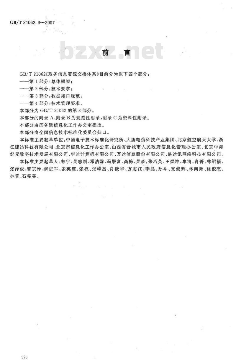 本部分为GB/T21062的第3部分。本部分的附录A、附录B为规范性附录,附录C为资料性附录。本部分由国务院信息化工作办公室提出。本部分由全国信息技术标准化委员会归口。本标准主要起草单位:中国电子技术标准化研究所、大唐电信科技产业集团、北京航空航天大学、浙江建达科技有限公司、北京市信息化工作办公室、山西省晋城市人民政府信息化管理办公室、北京中海纪元数字技术发展有限公司、华迪计算机有限公司、万达信息股份有限公司、易达讯网络科技有限公司。本标准主要起草人:林宁、吴志刚、邓洁霖、马殿富、高栋、吴焱、张巧英、王煜坤、牟清、肖菁、林绍福、张泽根、郭宗泽、柳进军、张英霞、张权、张峰昌、肖筱华、方志江、李晶、孙斗、支俊辉、林向阳、徐俊杰、林菁、石雯雯。
