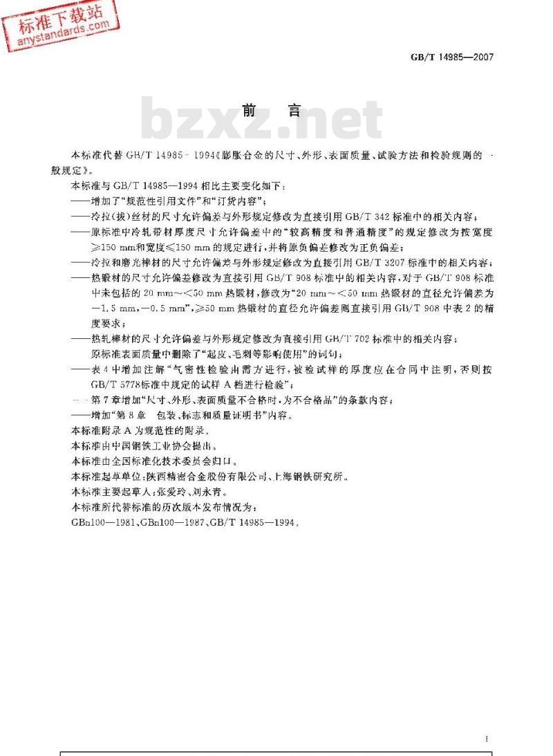 - GB/T 14985-2007 膨胀合金尺寸、外形、表面质量、试验方法和检验规则的一般规定