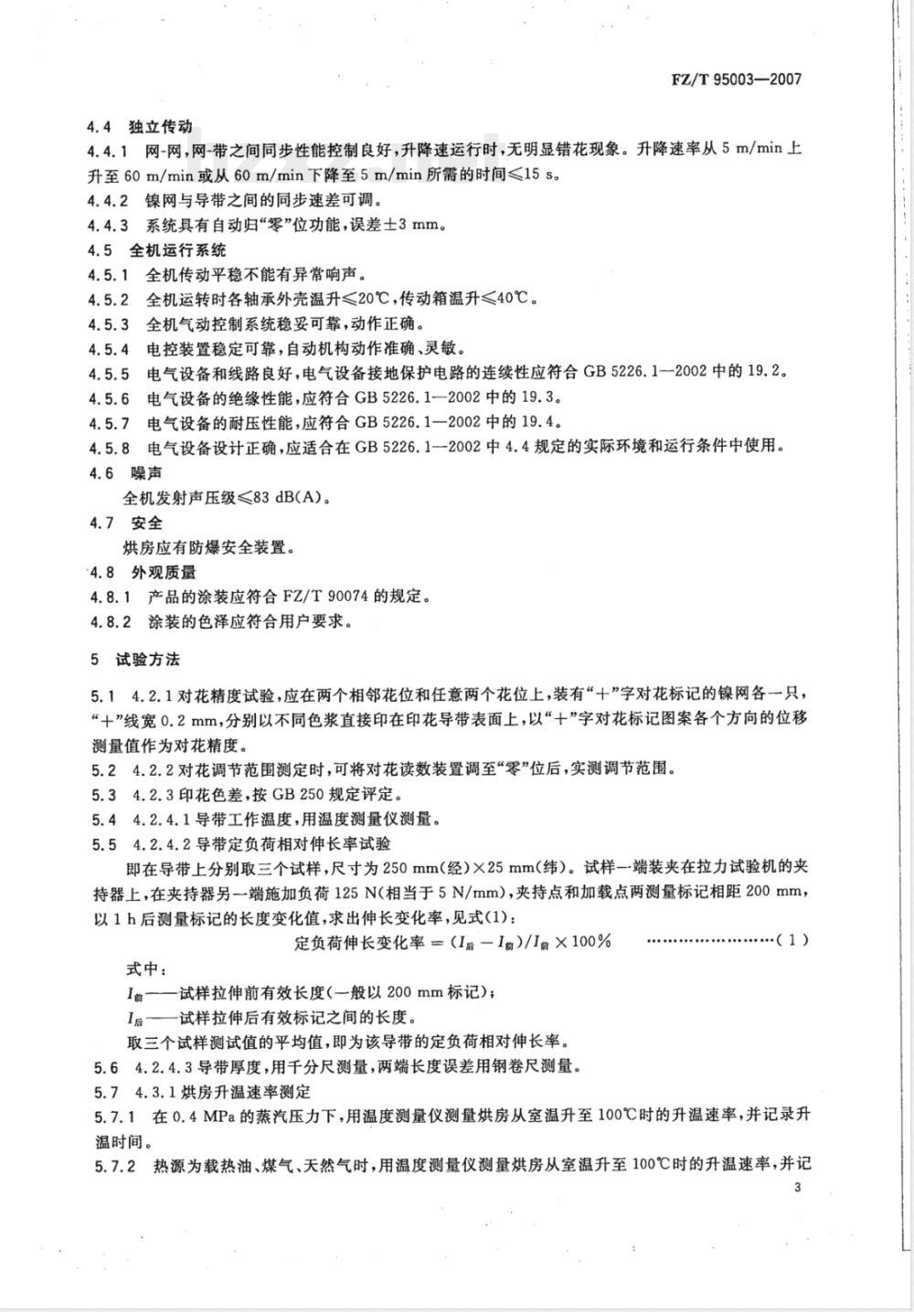 4.2.5印花镍网应符合FZ/T92045的规定。4.2.6供浆系统运行可靠,圆网内浆面稳定,自控灵敏。4.2.7上胶装置调整方便,上胶均匀,贴布效果良好。4.2.8印花导带洗涤干净,无残留水及浆料。4.3烘燥